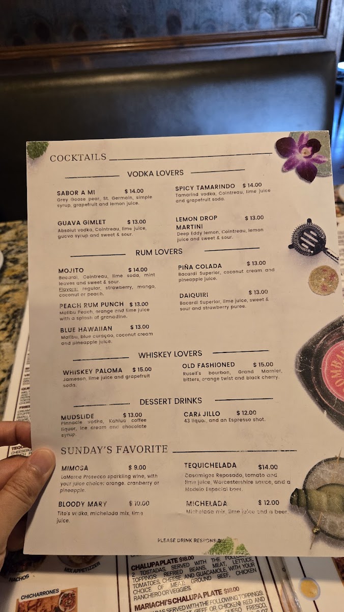 The main dishes shine with variety—crispy tacos, satisfying chalupas, and standout items like the Tacos al Carbon, featuring tender beef or chicken fajita on flour tortillas accompanied by pico de gallo and guacamole. Seafood fans will appreciate the Mariachi's Tacos, blending shrimp with grilled veggies for a balanced, flavorful bite.